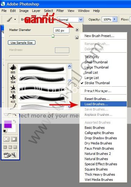 - เมื่อเลือกแล้ว จะมีเมนูด้านบน เพิ่มขึ้นมา ให้คลิกเลือก สามเหลี่ยมรูปเล็กๆ เลือก Load Brush… ดังรูป