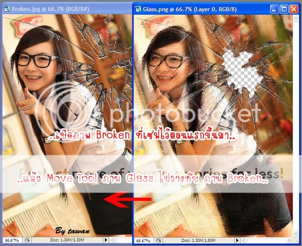 - ใช้เครื่องมือ Move Tool ลากภาพ Glass ไปวางทับภาพ Broken
