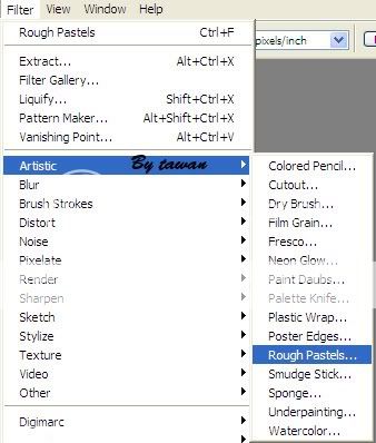 7. แล้วไปที่เมนู Filter >> Artstic >> Rough Pastels.. กำหนดค่าตามภาพ..