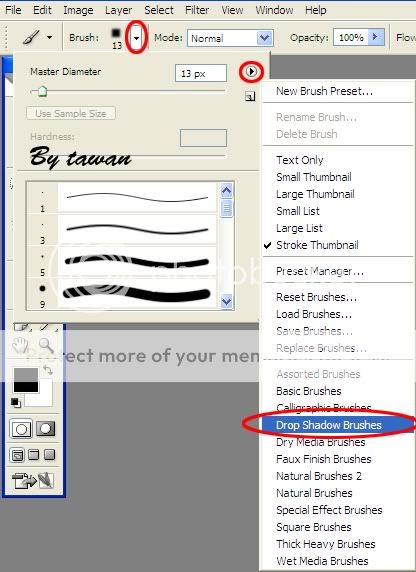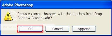 - คลิกปุ่มสามเหลี่ยมที่มาร์คสีแดงเอาไว้ แล้วเลือกใช้บรัชชื่อ Drop shadow brush จะมีหน้าต่างขึ้นมาให้กด OK. ไปเลย