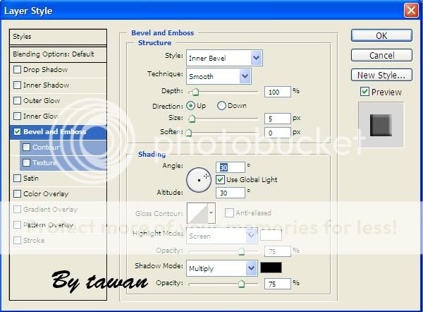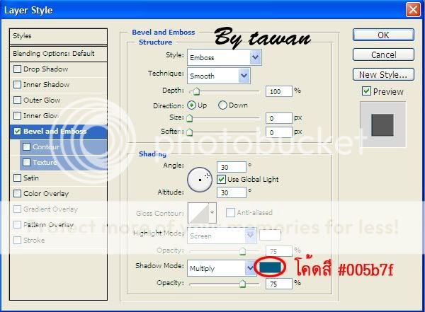 - คลิกที่ปุ่ม Add a Layer Style เลือก Bevel and Emboss.. กำหนดค่าตามภาพ..