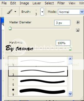 - ไปที่เครื่องมือ Brush Tool เลือกหัวบรัชเบอร์เล็กวาดเส้นลวดลงไป ( ขั้นตอนวาดเส้นลวด..ละโคตรยากเลย )